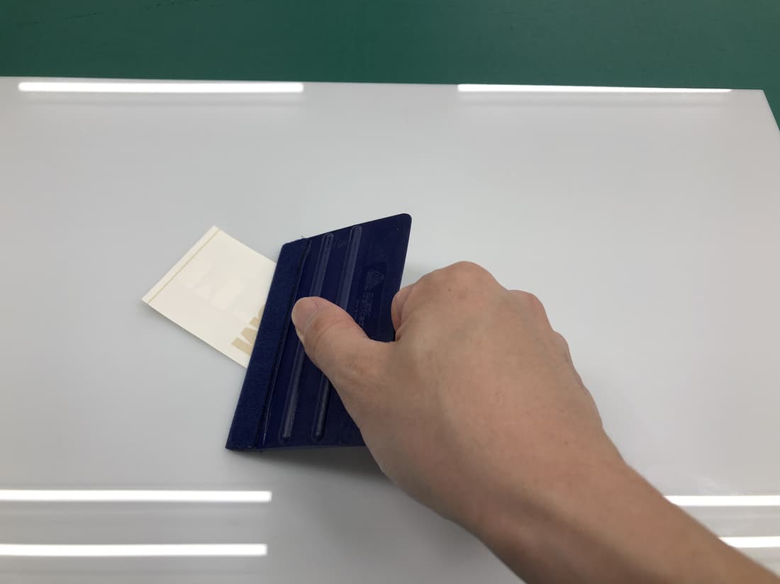 貼った部分をスキージーでこすって空気を抜くのではなく、少しずつスキージーで圧着していきます。